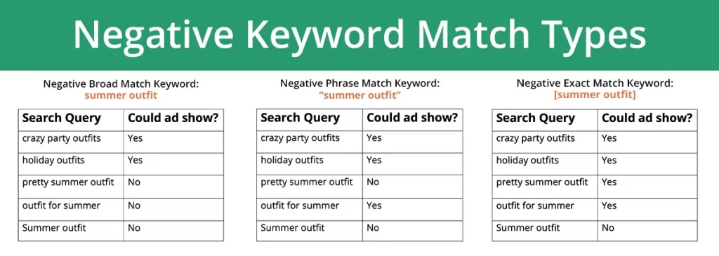 Negative match types prevent your ads from appearing on specific keywords that are irrelevant to your business.